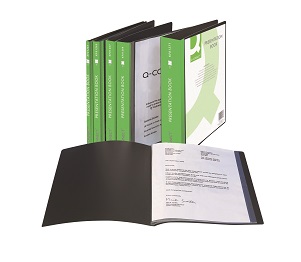 format A4, polipropilenski ovitek debeline 460 mikronov 20 vložnih folij debeline 38 mikronov vložni žep na sprednji platnici in hrbtišču barva črna embalaža 1/12/60