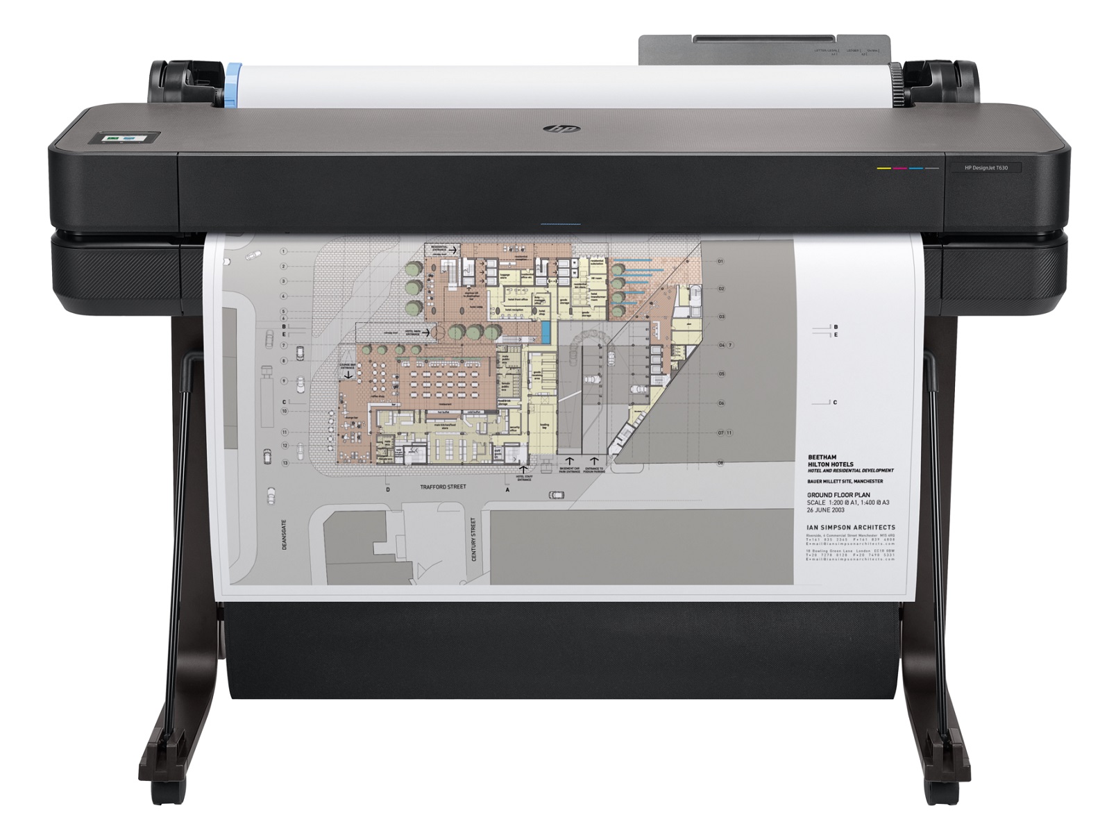 tiskalnik za tiskanje velikih formatov papirja, s stojalom in avtomatskim podajalnikom največja širina tiska: 914mm (36") USB, LAN, WiFi črnilo: HP No.712 minimalne mere: 1317x605x932 mm ločljivost tiskanja: do 2400x1200 dpi hitrost tiskanja: do 30 s/stran na A1 podprte velikosti papirja ročno podajanje: A4, A3, A2, A1, A0, po meri (210x279 do 914x1897 mm) podprte velikosti papirja samodejni podajalnik: A4, A3, po meri (210x279 do 330x482 mm) podprte teže papirja ročno podajanje: 60 do 280 g/m2 podprte teže papirja samodejni podajalnik: 60 do 220 g/m2 pomnilnik: 1 GB samodejni vodoravni rezalnik način povezave: USB, LAN, WiFi črnilo : HP No.712 3ED67A, 3ED68A, 3ED69A, 3ED71A najmanjše mere: 1317x605x932 mm teža: 34,7 kg
