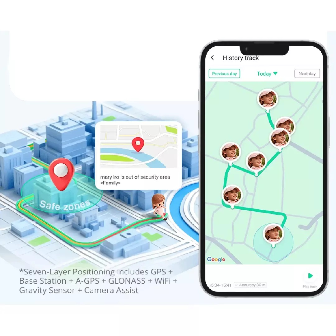 - 1.3" zaslon, 240 x 240 Px - Navigacija: GPS + Wi-Fi Odašiljač, GPS/A-GPS, GLONASS, Beidou - Funkcije: SOS Gumb, Pozivi, Video Pozivi, Glasovni pozivi, Brojač Koraka, Način Rada "Učionica", SIM Kartica: Nano-SIM Audio: 1 Zvučnik + 1 Mikrofon Kamera: 2 MP - Trajanje baterije: do 5 dana - Vodootpornost: IPX8 - dimenzije: 55.8x41.8x15.6mm (bez remena) - masa: 36g (bez remena) - Baterija: 850 mAh